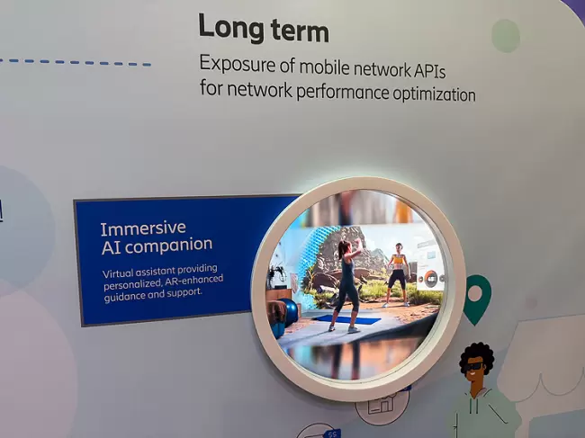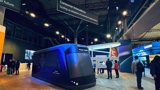 在展区内,你还可以看到一辆非常具有未来感设计的通勤火车,在这里我们可以通过AR眼镜,体验远程参与办公会议、视频的场景。爱立信还与Meta、苹果等厂商还在继续探索XR技术未来在工业培训、娱乐等领域的潜力。