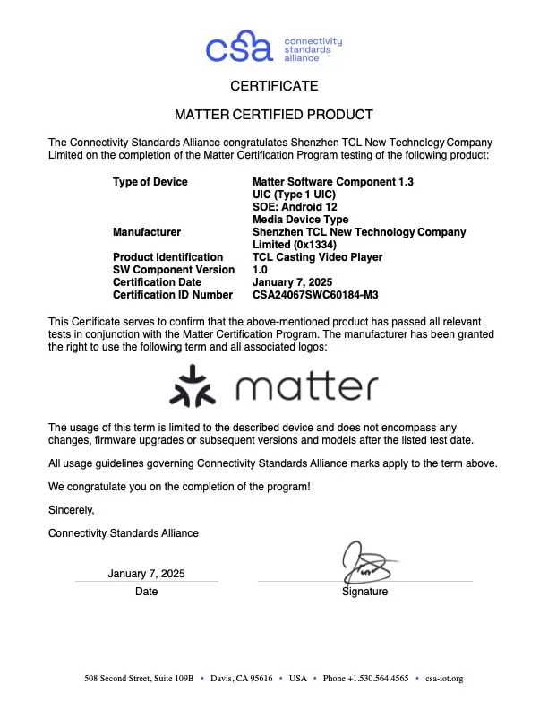作为智能物联领域的先行者,TCL实业始终走在行业技术革新的前沿。继2023年2月TCL TV成为全球首个获得Matter 1.0 Basic Video Player认证的电视产品后,2024年12月,TCL实业再次取得Matter 1.3 Casting Video Player软件认证,成为目前唯一获得该认证的电视厂商。这一系列突破不仅展示了TCL实业在Matter标准研究中的领先地位,更体现了其深度拥抱开放生态、以用户为中心的理念。