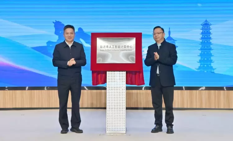 宿迁市委常委、常务副市长仲小兵(左)与开普云董事长汪敏(右)为“宿迁市人工智能计算中心”揭牌