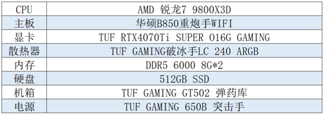 参考官方的配置需求,如果你是AMD平台的忠实爱好者,这套锐龙9000硬汉主机定会让你眼前一亮。以华硕B850重炮手WIFI主板为核心,搭配AMD锐龙7 9800X3D处理器、华硕TUF RTX4070Ti SUPER O16G GAMING显卡等令电竞玩家心动的电竞装备,可高画质顺畅运行各类大作,并带给玩家无与伦比的整机灯效和游戏体验!