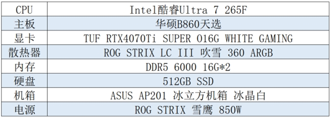 接下来推荐的这套是玩家心中的“白月光”。以华硕B860天选主板为核心,搭配Intel酷睿Ultra 7 265F处理器、华硕TUF RTX4070Ti SUPER O16G WHITE GAMING显卡等高性能硬件,不仅带来冰川秘境般的视觉享受,更有巅峰战力,高帧畅玩无压力!