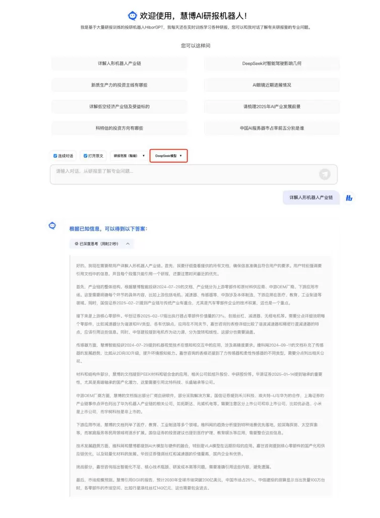慧博调研董事长,上海外国语大学数字经济学教授何佳川介绍,慧博AI研报机器人所有参考资料均来自券商、上市公司公告,协会等专业机构的研究报告。目前的数据库拥有1800多万份海内外上市公司研究报告,慧博APP的专业投资人注册用户已超过500万。“本次慧博AI研究大模型接入DeepSeek后,除了拥有深度思考之外,还能实现图片信息识别,以及输出表格等功能,将大幅帮助研究机构和上市公司提升研究精度和准度。”