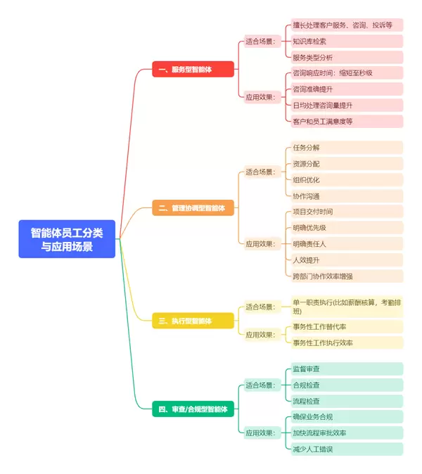 利唐i人事指出,未来的人力资源管理模式将发生重大变革,智能体员工将改写传统人力资源管理的底层逻辑, 需要从以“人”为中心转向以人 + “智能体”为中心。智能体员工具备类似人的属性,如有自己的岗位职责、岗位序列、电子档案、过程管理和绩效等。按照能力可分为以下几类: