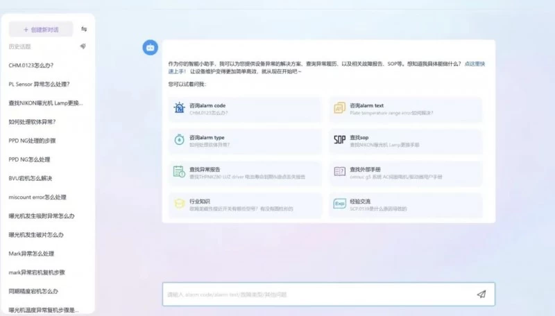 通过对泛半导体行业know-how的深厚积累和内化,格创东智结合对数百家泛半导体领域企业的服务实践,因需而生的设备知识库Agent,当前主要面向设备异常场景,提供设备异常code/type/text查询、故障报告检索、智能工单填写、SOP查找、外部文献检索、行业知识随行等功能。通过接入不同设备管理系统、设备生产参数、工程师工单、报告等多模态知识库后,发挥其无穷的知识库问答和生成式建议能力。通过多模态交互数据,实时响应设备异常问题,提供精准解决方案,成为设备知识管理业务域的 “AI大脑”。