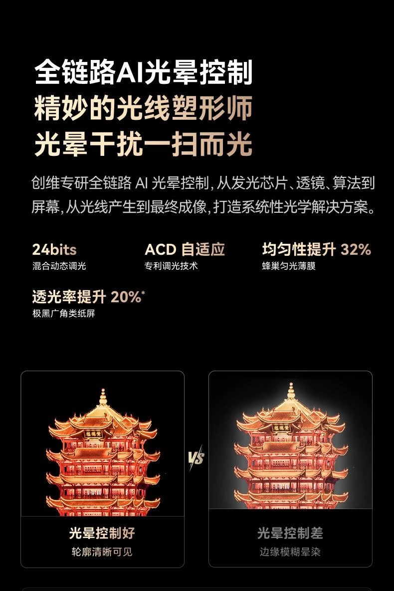 光晕控制曾是Mini LED电视的短板,但创维黑骑士A5F Pro拥有同价位最高规格的背光方案和画质芯片,搭载了创维新一代全链路AI光晕控制技术,能系统性解决这一痛点。通过利用ACD独家专利调光,该技术可以指数级提升Mini LED的显示效果,覆盖发光芯片、背光、算法和屏体整个链路,让画质更清晰、更透亮,实现媲美OLED的显示效果。