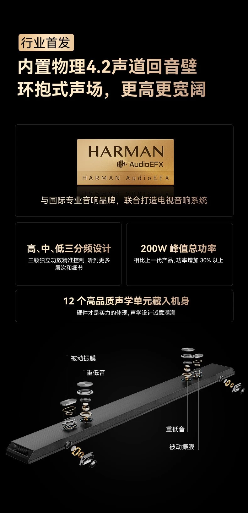 此次,创维黑骑士A5F Pro进一步强化了音效优势,搭载了同级唯一内置4.2声道回音壁,相当于价值5000元的Sound Bar回音壁,可以“秒杀”市面上绝大部分的电视产品。其内置12个高品质声学单元,36W双重低音,额定功率78W,峰值功率223W,并通过科学分布声学单元增加了左右两路环绕声道,实现多声道环抱式发声,因此也是万元内唯一一款带独立侧环绕的电视。同样令人惊喜的是它还拥有哈曼专业调音,电影临场感拉满。