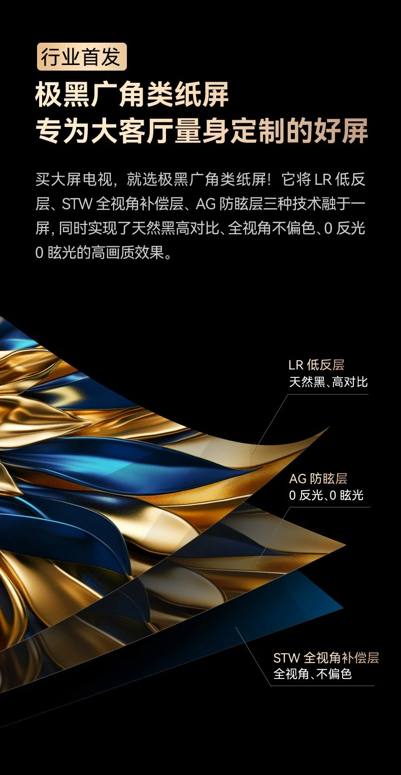 具体而言,LR低反层可以实现像OLED一样的天然黑和高对比;STW全视角补偿层带来了全视角的观影体验,有效消除侧视泛白、偏色的问题,全家人从不同角度看电影都能拥有最佳视觉效果;AG防眩层实现屏幕0反光、0眩光,解决了OLED电视在灯光复杂的环境下出现反光、画面看不见、亮度低等显示痛点。