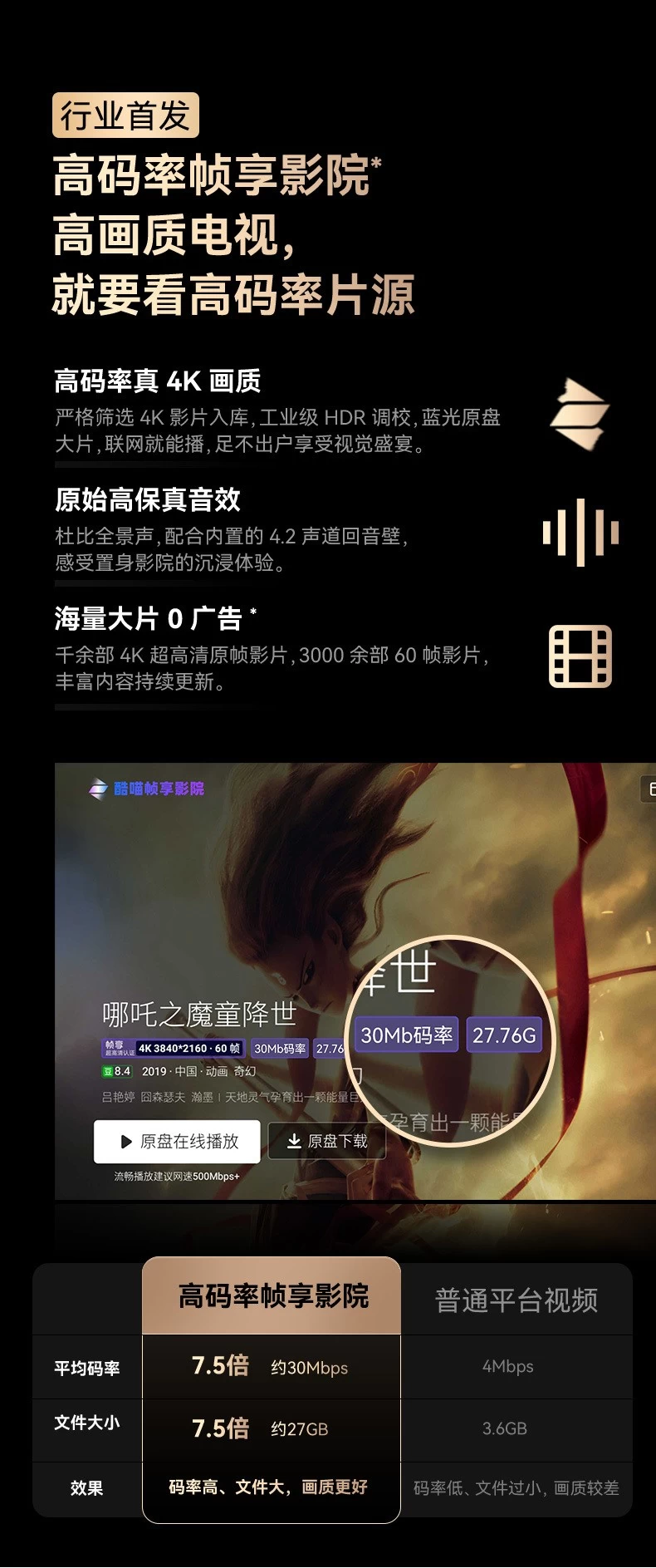 顶级显示技术需要搭配最佳高码率内容。创维黑骑士A5F Pro经过严格的测试和验证,成为首批通过帧享影院超高清技术规格和性能认证的电视产品,支持工业级HDR调校,提供真4K超清观影体验;首发酷喵高码率帧享影院,包含7000+真4K无损大片,且0广告、0干扰,为用户打造私人影院级享受。