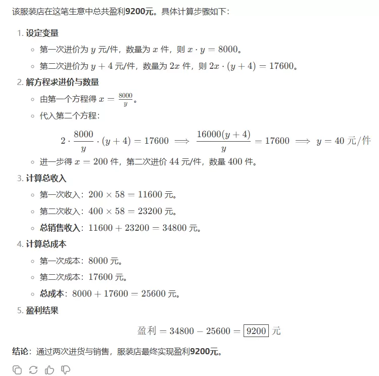 题目 2:某服装店的老板在武汉看中一种夏季衬衫,就用 8000 元购进若干件,以每件 58 元的价格出售,很快售完,又用了 17600 元同样衬衫,数量是第一次的 2 倍,每件进价比第一次多了 4 元,服装店仍然按每件 58 元出售全部售完,问该服装店这笔生意的盈利情况如何?
