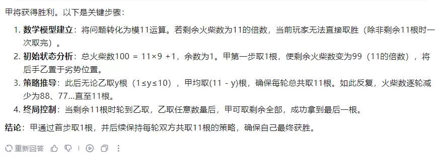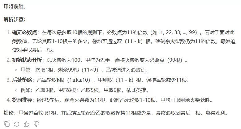 题目 5:有 100 根火柴,甲、乙两人轮流取火柴,规定每次取的根数不得超过 10 根,也不能不取。规定谁取到最后一根火柴谁就获胜。如果两人都采用最佳方法,甲先取,那么谁将获得胜利?