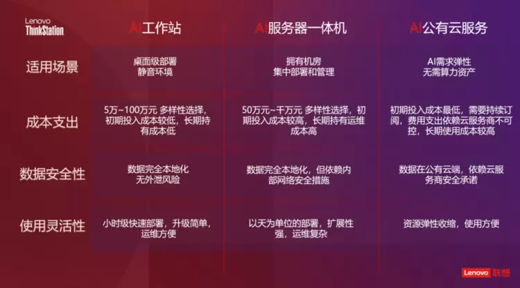 此次发布,联想推出涵盖十大业务场景的AI工作站,全面支持DeepSeek大模型私有化部署,从模型推理、知识库管理和智能体开发等四大开发场景,到智慧办公、代码开发、客户服务、公文写作、视频生成及智能体实训教育等六大用户应用场景,形成了一套完整且全面的 AI 应用矩阵。