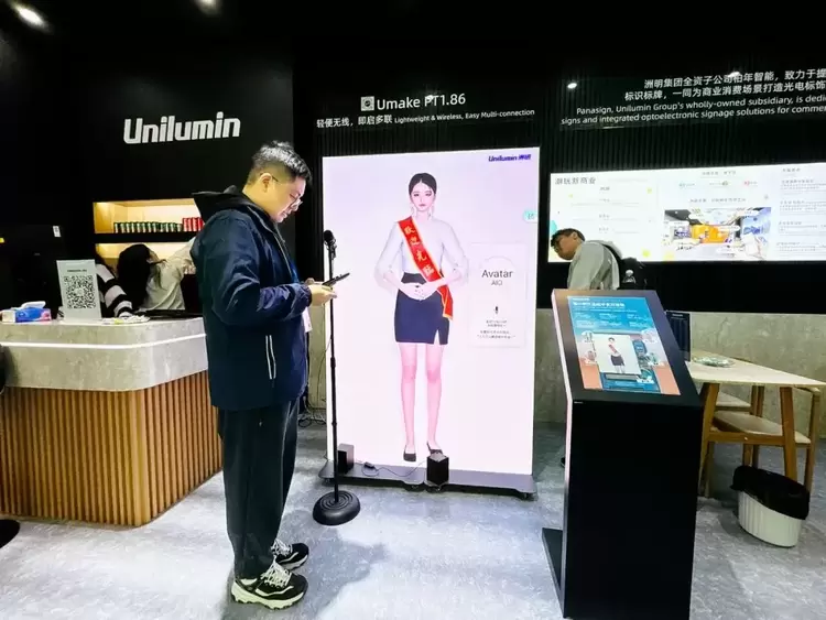 走进洲明科技的展位,一台“会说话”的屏形机器人最是吸睛。洲明本次展出的屏形机器人,将高拟真数字人形象深度融合多功能海报机,实现“静态展示+动态交互”的全新升级。