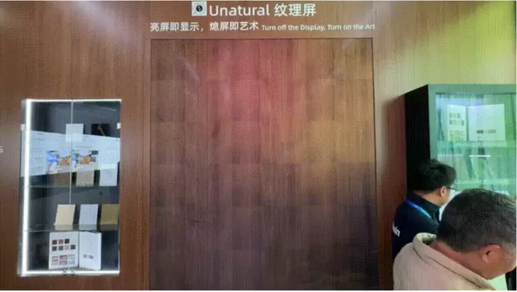 展位的另一侧,一块看似普通的“木纹墙面”吸引了众多观众的目光。当屏幕点亮时,墙面瞬间化身为高清显示屏,画面细腻逼真;熄屏时,又恢复了自然的纹理效果。