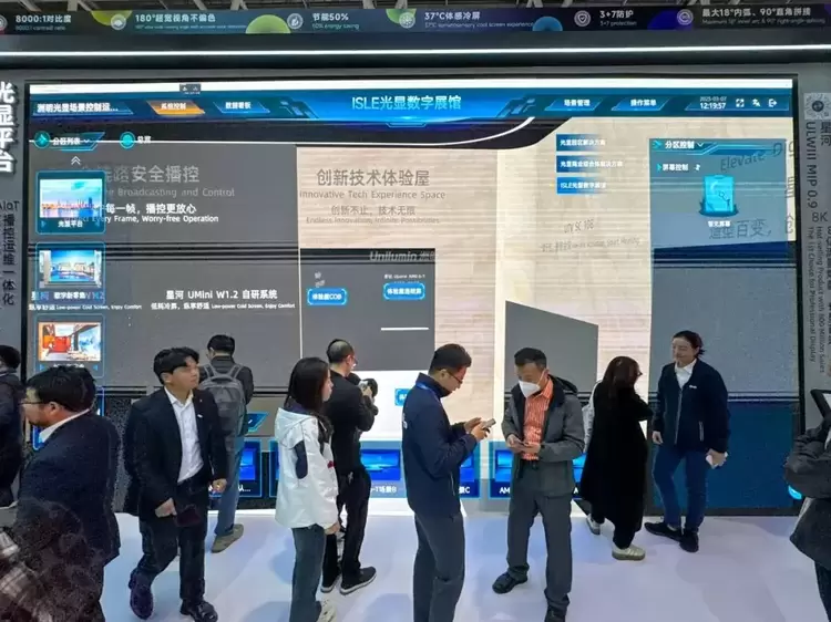 在展位的中心区域,一块巨大的MIP 8K大屏——ULWⅢ MIP 0.9吸引了众多观众驻足。该产品采用自研EBL+技术,低灰细腻、高亮清晰,且屏前无热感(体感冷屏设计),并采用全倒装芯片+共阴驱动,比常规屏节能50%。