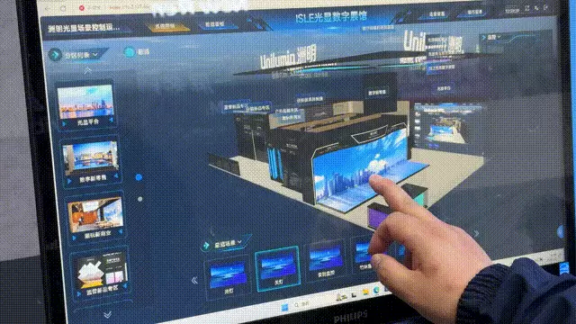 洲明以其作为交互终端,利用数字孪生建模演示光显平台软件功能,配合全场显示。洲明科技自研的光显平台,融合AI、大模型、物联网、数字孪生等技术,构建3D可视化操作界面,实现“所见即所得”的远程管理。展台所有的屏幕、灯光、音响、播放器、摄像头、电源都能通过该平台统一管理、场景智能联动等功能,内置AI语音识别功能,解放双手,提升管理效率。