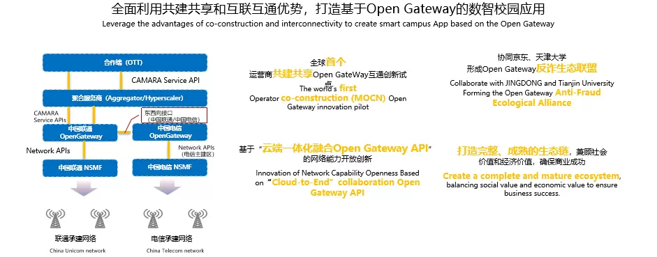天津联通与天津电信长期推进4/5G网络共建共享,形成了诸多创新成果。本课题在中国联通集团研究院的统一组织下,由天津联通协同天津电信,通过与天津大学、京东集团、中兴通讯的合作,融合Open Gateway、大数据、大模型等技术,利用号码验证、网络切片、QOD、Site to Cloud等API,满足校园的在线学习、教学实训、网购诈骗防御等高并发、高密度业务场景需求,助力天津大学构建安全可信数字校园,构筑了数字经济高质量发展新底座,开辟了赋能数字化变革新范式。同时,该课题的研究也为进一步释放共享网络潜能,打造数据互信、能力互通、生产协同的网络智慧共治体系,牵引产业链推进5G“建、用、研”协同发展,奠定了扎实的网络基础。