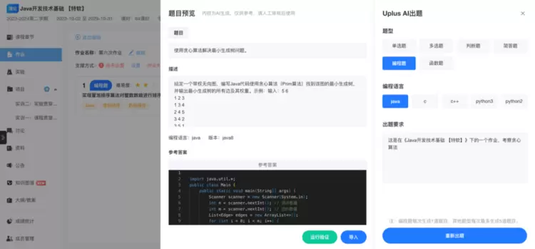 AI出题功能专为教师设计,能够根据教学需求(如难度、知识点范围)快速生成题目。除了传统的选择题、填空题、判断题外,还能高效生成编程题,并支持自测功能,确保题目的高可用性和准确性。这一功能极大地提升了教师的出题效率,同时保证了题目的多样性和针对性。