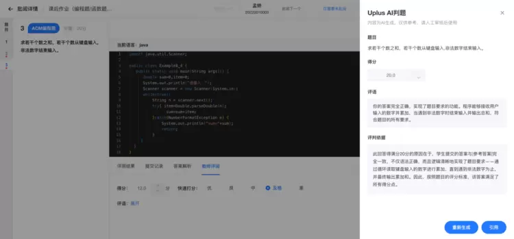 AI判题功能为教师提供了强大的辅助工具,能够对主观题、编程题进行智能评判,不仅能够给出最终得分,还能提供详细的评判依据。其中编程题的过程性得分解决了编程题评判的难题,收获了众多教师的好评。在2024年期末考试中,太原理工大学使用U+平台AI批量判题功能对1500+人次的大规模考试进行批阅,原本需要一周的批改工作量,AI仅用几个小时就高效完成,显著提升了教学效率。