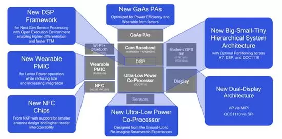 规格方面,骁龙3100基于28nm工艺,采用四核Cortex A7架构(32bit),主频1.2GHz,搭配一颗功耗低20倍的协处理器QCC1110(5.2x4mm,21mm2)和一颗高效的DSP,同时还集成NXP的NFC芯片。