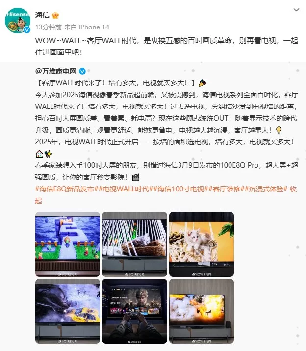 近日,万维家电网在观看“2025年海信视像春季新品超前瞻”后,在微博上抛出了一则重磅消息:海信电视全面百吋化,客厅WALL时代到来。