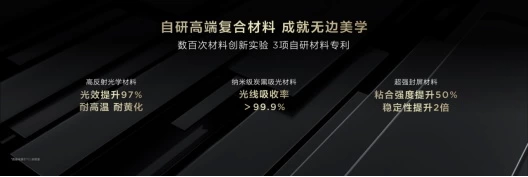 不仅如此,TCL通过数百次材料创新实验,获得3项自研材料专利,对各部分结构进行重大升级。其中,高反射光学材料不仅耐高温耐黄化,而且相比于普通材料光效提升97%;纳米级炭黑吸光材料则能达到超过99.9%的光线吸收率,使对各层级各部位的光线精细控制成为可能;对粘合强度提升50%的超强封屏材料的应用,在实现极景·无黑边外观的同时,稳定性也提升了2倍。