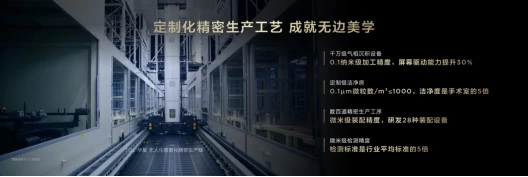 为了解决规模化量产问题,TCL华星采用价值千万的气相沉积设备,达到0.1纳米级加工精度,屏幕驱动能力提升30%。定制级洁净房内,0.1微米级的微粒数小于1000,洁净度是手术室的5倍。TCL还专门研发28种装配设备,实现微米级装配精度。检测精度同样达到微米级,检测标准是行业平均标准的5倍。