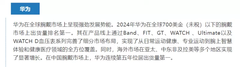 - 华为穿戴2024年出货量同比增长率登顶全球榜首,持续领跑中国市场