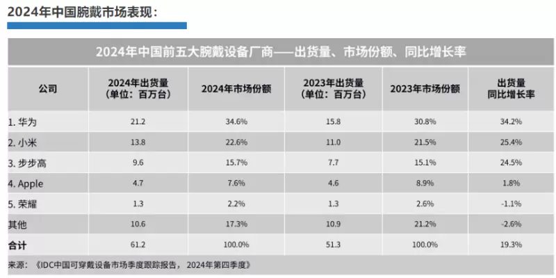 根据IDC最新发布的《全球可穿戴设备市场季度跟踪报告》显示,尽管2024年全球腕戴设备市场出货1.9亿台,同比下滑1.4%,中国市场仍逆势增长,出货量为6,116万台,同比增长19.3%,是全球最大腕戴设备市场。头部厂商中,华为表现格外突出,在中国市场已连续五年稳居出货量第一,出货量同比增长率33.6%为全球第一。