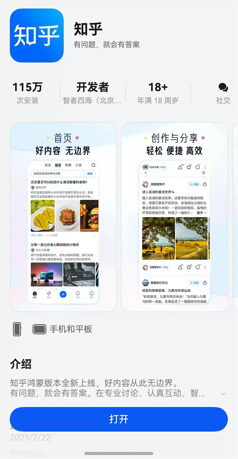 知乎作为数亿用户获取信息、交流观点的首选平台,已经全面适配原生鸿蒙并在手机和平板端应用市场正式上架。随着数个月的持续迭代,目前不仅具备了推荐/热榜、问答、书架/课程、创作中心等核心功能,更深度融合原生鸿蒙的统一拖拽、统一取词识图等创新特性,实现了搜索效率、内容交互、社交体验的全面跃升,为海量原生鸿蒙用户探索和分享知识开辟了新路径。