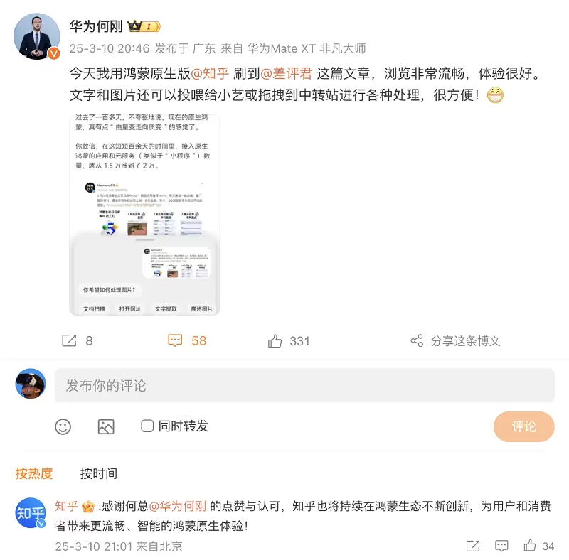 华为终端BG CEO何刚近期就在微博发文,高度评价了鸿蒙原生版知乎的创新体验,特别是支持将图文投喂小艺或者拖拽到中转站,非常方便。知乎官方则迅速回应,表示将持续在鸿蒙生态不断创新,为用户和消费者带来更流畅、智能的体验。