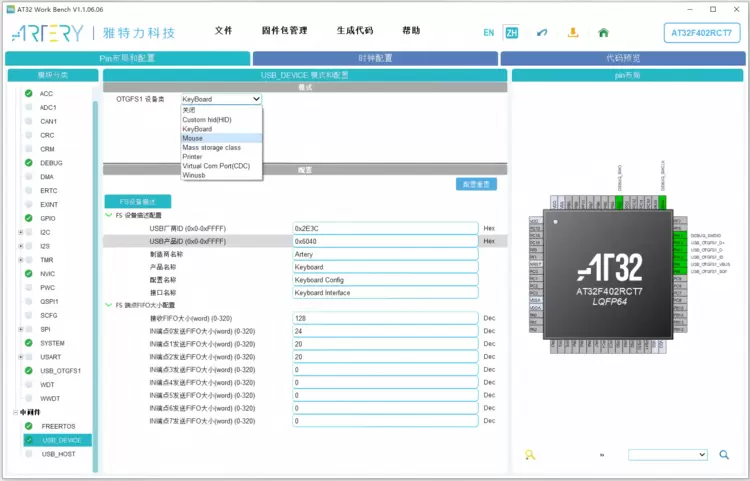 在嵌入式系统中,使用USB接口可以实现高速数据传输和通信,方便与计算机进行连接和控制。AT32 Workbench新增了对USB_DEVICE和USB_HOST中间件的支持,让开发者更轻松地配置和管理USB设备通信。USB_DEVICE中间件允许开发者快速将AT32设备配置为各类USB设备,如USB虚拟串口、大容量存储设备等,方便与电脑或其他主机设备进行数据交互,在数据传输、固件升级等场景中发挥重要作用。而USB_HOST中间件则赋予了AT32设备作为主机的能力,能够连接并控制诸如USB鼠标、键盘、U盘等外设,极大地丰富了设备的功能和应用场景。