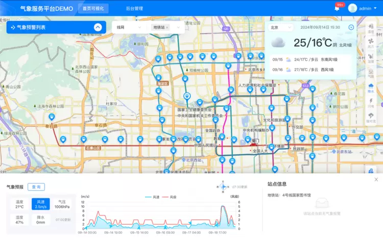 通过该平台,一线运营人员能够清晰直观地了解地铁运营过程中气象变动和影响范围。此外,墨迹天气还通过实时监测地铁站点、车辆段、停车场等重点区间的多类气象数据,实现全面系统性的气象数据覆盖。这些数据为预测未来时间段内的气象趋势提供了有力支撑,同时也能够对地铁线网覆盖区域市/县(区)的暴雨、暴雪、雷电、冰雹、大雾、大风、沙尘暴等灾害性或突发性天气进行预警。