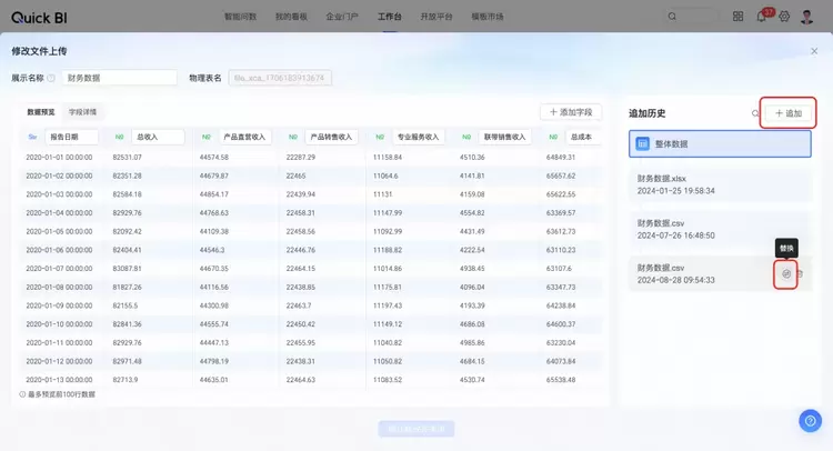 如今,借助Quick BI,业务团队可以直接在前端上传、替换和追加外部下载的Excel明细数据,并实时关联数据仓库的数据进行联合分析。这一创新方式不仅显著提升了数据分析的效率,还优化了系统性能,真正实现了业务自助化操作。
