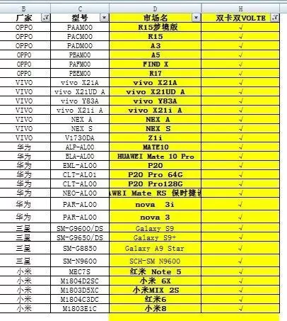 根据网友介绍,这份清单是由中国电信内部排查后罗列的支持双卡双4G双VoLTE的手机,这其中,OPPO有六款,vivo有7款,华为有8款,三星有4款,小米有5款。型号主要涉及这些品牌的中高端手机系列。
