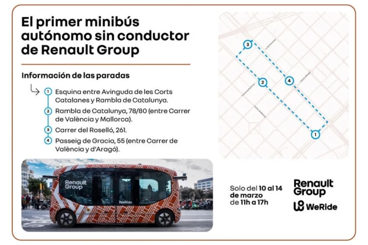 经巴塞罗那市政厅与西班牙交通总局(Directorate General of Traffic, DGT)授权许可,本次文远小巴试运营服务将于3月10日至14日、每天11:00-17:00向公众开放,运营环线超2公里,沿途设置4个上下车站点,途径巴塞罗那巴特罗之家(Casa Batlló)和米拉之家(La Pedrera)等地标性建筑。