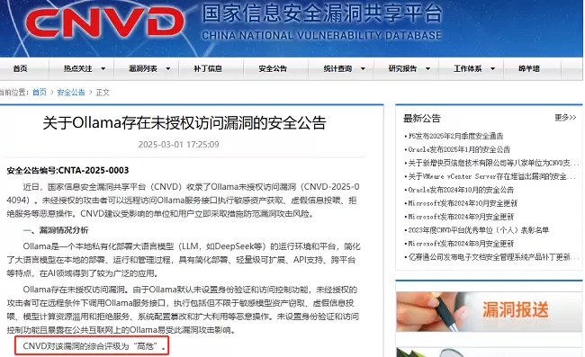 近日,国家网络安全通报中心通报CNTA-2025-003安全公告,大模型工具Ollama存在严重安全风险,Ollama 默认配置存在未授权访问和模型窃取风险,可能会导致数据泄露、服务中断等风险。