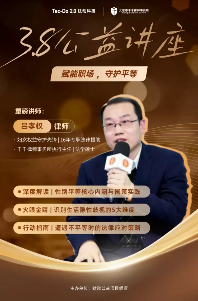 3月5日,钛动科技携手千千律师事务所举办了一场以“赋能职场,守护平等”为主题的公益讲座活动,通过深入探讨性别平等的核心内涵,推动社会性别平等认知和实践。