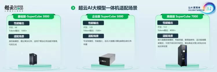 2月28日,超云联合生态合作伙伴正式发布了SuperCube系列AI大模型一体机——高级版SuperCube7000、企业版SuperCube5000以及基础版SuperCube3000,同时还展示了明星GPU服务器及配套的软件与生态方案。
