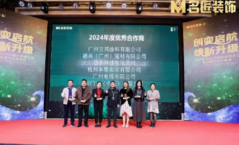 名匠装饰集团总裁李俊先生登台致辞,向每一位股东经理及合作伙伴的鼎力支持表示衷心感谢,并宣读了2024年度优秀合作商名单,获得2024优秀合作商的公司有广州立邦涂料有限公司、德高(广州)建材有限公司、日丰科技有限公司、杭州丰果实业有限公司、广州电缆有限公司、西门子(中国)有限公司。