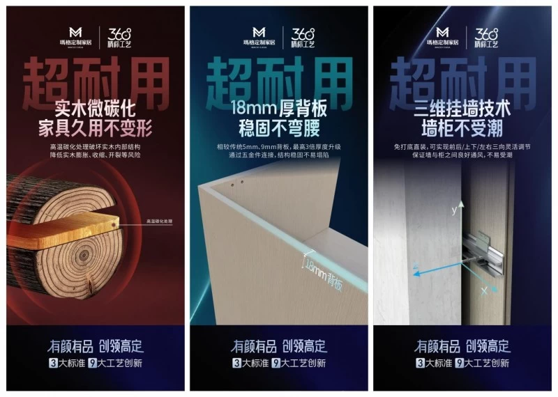 20年发展历程,产品力一直以来是玛格的核心专长,立足中高端人群需求,以高端实木为定制基因,围绕用户对家居“颜值、耐用度、环保”3大维度痛点,以9大技术创新,重构360°精标工艺体系,让“有颜有品”成为每一个高端家庭的标准配置。