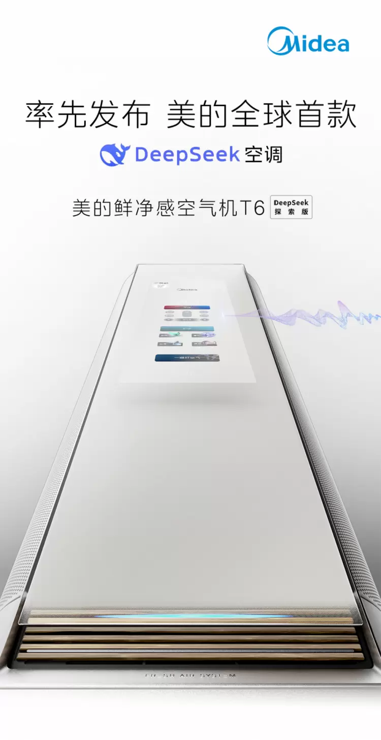 3月初,美的空调推出首款DeepSeek空调—美的鲜净感空气机T6,凭借私有化部署的DeepSeek R1大模型,可以一键智控,主动适应不同天气和温度环境,使室内温度、湿度始终保持在一个舒适的体感上,并有效提升室内空气质量,大幅度提升健康生活质量。