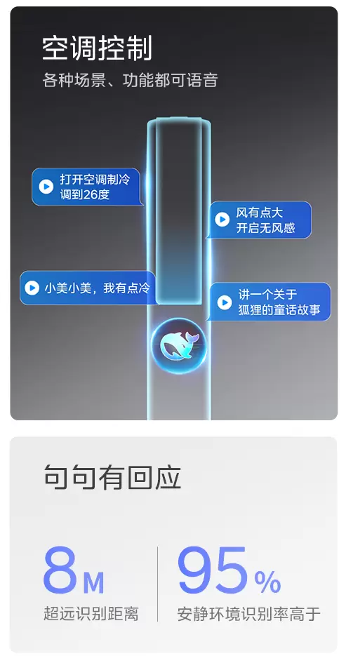 此外,美的鲜净感空气机T6通过美的美言大模型,深度融合DeepSeek、讯飞星火及豆包三大模型的核心能力,可以实现“一句话多意图理解”、“模糊指令控制”和空气知识问答,拥有最高L5级别的智能语音能力,在线离线都能用,支持超百万指令词,0.4秒极速响应,使之做到越用越懂用户,让智能化真正成为生活的一部分!