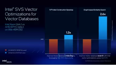 值得一提的是,至强6平台在业界率先支持8800MT/s的超高速内存MRDIMM,因此在运行小型语言模型的AI推理时也有着极大的优势。此外,在处理矢量数据库的搜索需求时,至强6700P在离线构建索引表的过程中,相比于同样配备64核的AMD EPYC 9005,性能高出30%。在线上搜索过程中,与专门针对大规模矢量数据库的索引创新英特尔Scalable Vector Search (SVS)共同协作,其性能优势甚至可以达到2.6倍。