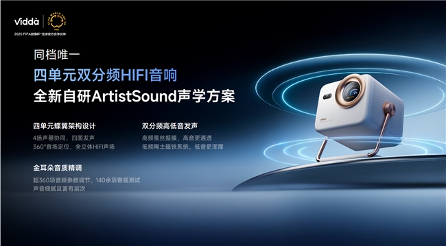 而在音响方面,Vidda M2 Pro这次采用了全新的自研ArtistSound声学方案,四个扬声器高低频分别发声,音质更好,而且可以提供360°声场。这样的四单元双分频HiFi音响依然是同档唯一的存在。
