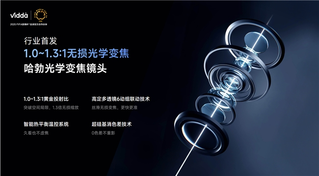 据介绍,Vidda M2 Pro搭载的全新哈勃光学变焦镜头投射比为1.0-1.3:1,属于黄金投射比例。其不仅可以2.2米投出百英寸巨幕,还可以实现1.3倍4K无损光学变焦,满足大多数用户的使用场景。同时,由于采用了全新自研高端定制多透镜6动组系统联动技术,M2 Pro的画面缩放更加快速、丝滑流畅;而超硅基消色差技术的应用,更使其达到了行业领先的0色差水平,文字和图像显示不重影,画质更加干净通透。