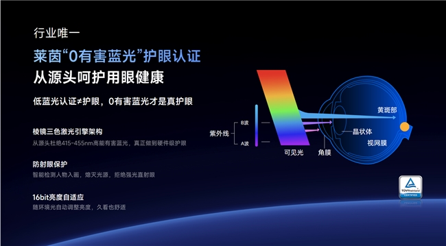 由于激光色彩纯度极高的特性,三色激光投影色彩表现上远超常见民用显示产品。其实现了110% BT.2020的超高色域(超过了150% DCI-P3),以及△E<0.9超高色准,已经远远超过了传统的液晶和OLED电视。此外,Vidda三色激光投影还拥有行业唯一的德国莱茵TUV“0有害蓝光”护眼认证,是市面上最为健康护眼的显示类产品。