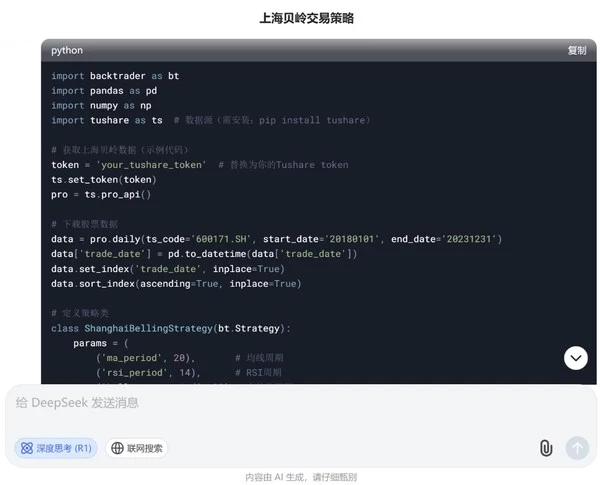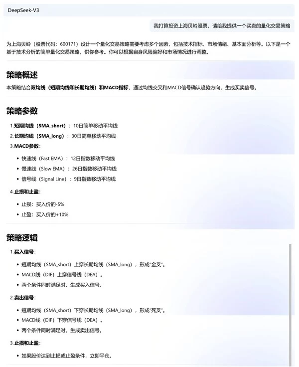 投资者需通过交互指令从DeepSeek获取策略的核心交易逻辑(明确买卖触发条件),无需接触任何代码。