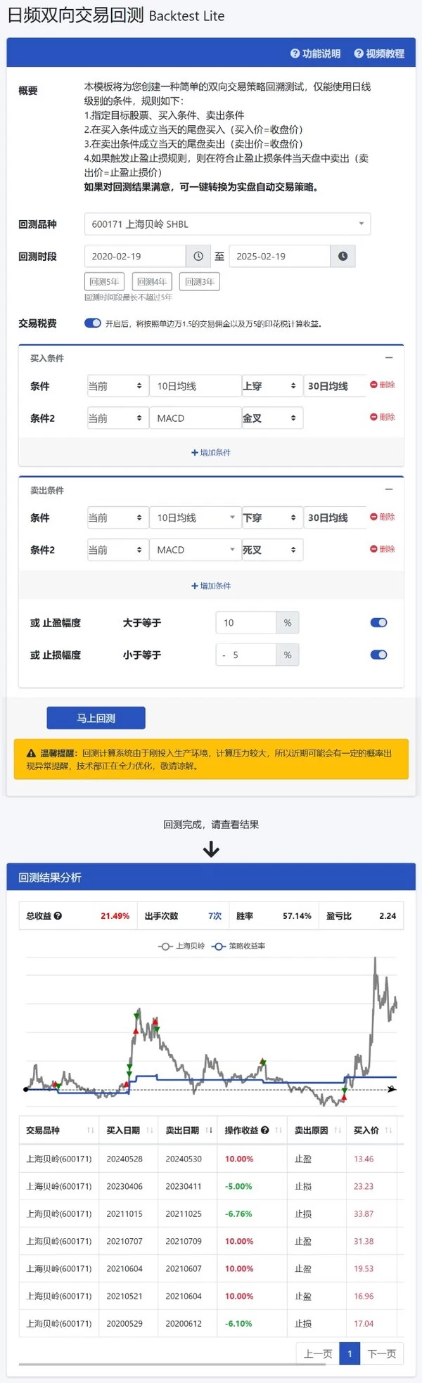 平台内置专业回测系统,支持近5年历史数据回测,提供详细的回测报告,以此全方位对策略进行评估。