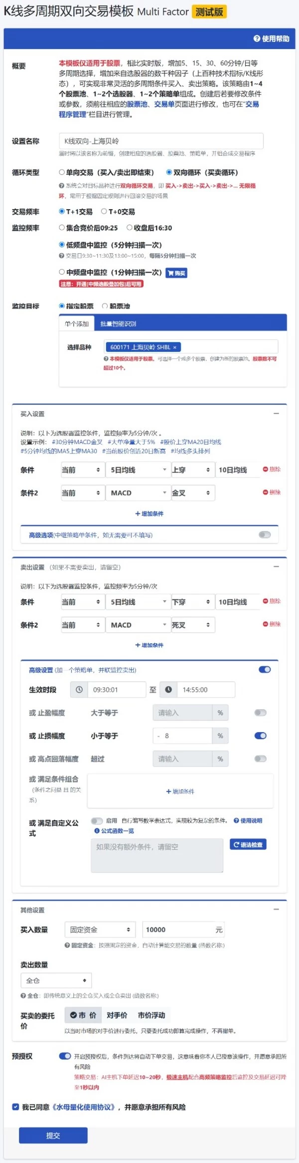 水母量化K线多周期双向交易模板创建界面