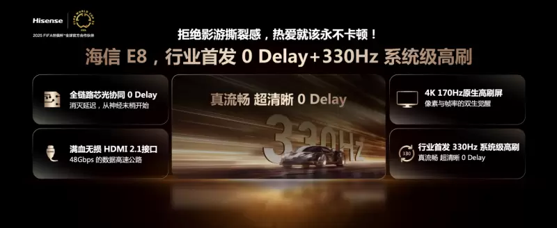 作为对比,海信E8Q Pro带来了具有颠覆性的0 Delay+HSR330Hz系统级高刷解决方案。全链路芯光协同0延迟,实现4K 170Hz原生刷新率与动态330Hz超频的完美平衡,支持170Hz FreeSync Premium Pro。配合4路满血HDMI 2.1接口提供的48Gbps超带宽,进一步提升游戏效果。